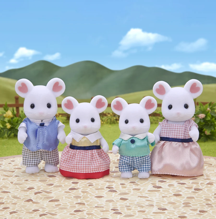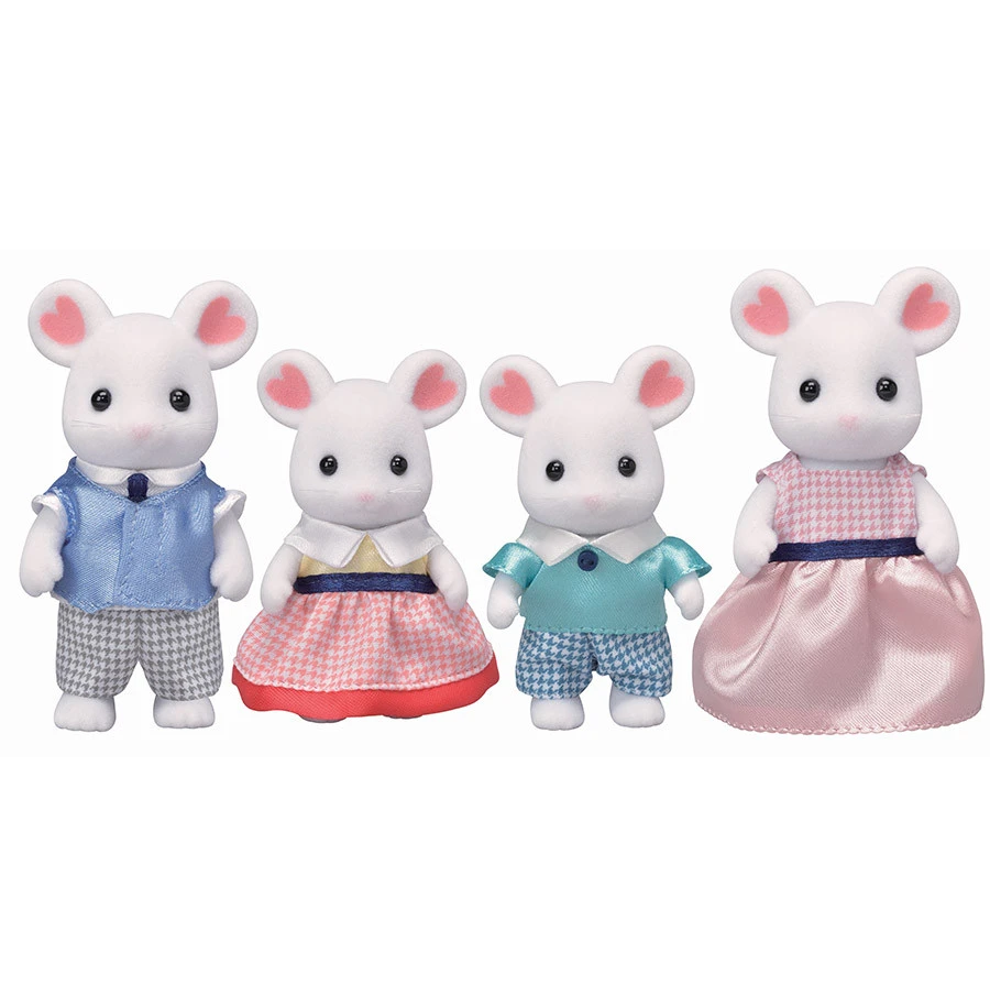 La famille souris marshmallow est composĂ©e de 4 membres : Bianca la maman, Bernard le papa, Christopher le fils et Katherine la fille. Elle peut ĂȘtre complĂ©tĂ©e avec le bĂ©bĂ© souris marshmallow, les jumeaux souris marshmallow et les triplĂ©s souris marshmallow(vendus sĂ©parĂ©ment). Tous sont habillĂ©s avec soin et leurs vĂȘtements cousus Ă la main peuvent ĂȘtre enlevĂ©s et remis Ă loisir. Les figurines sont toutes articulĂ©es.
