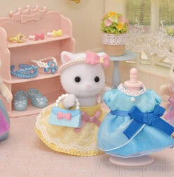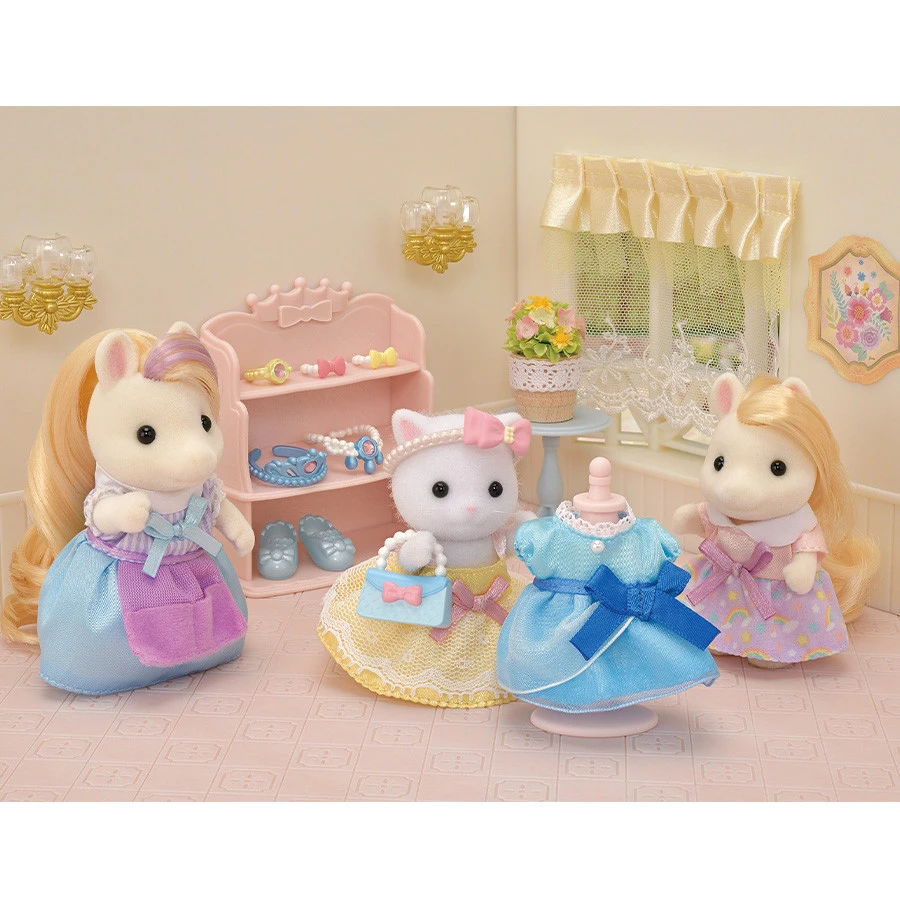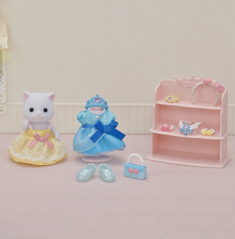 1 figurine fille chat persan, 1 étagère, 1 mannequin, 2 robes, 1 paire de chaussures, 1 sac à main, de nombreux bijoux