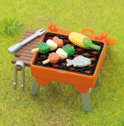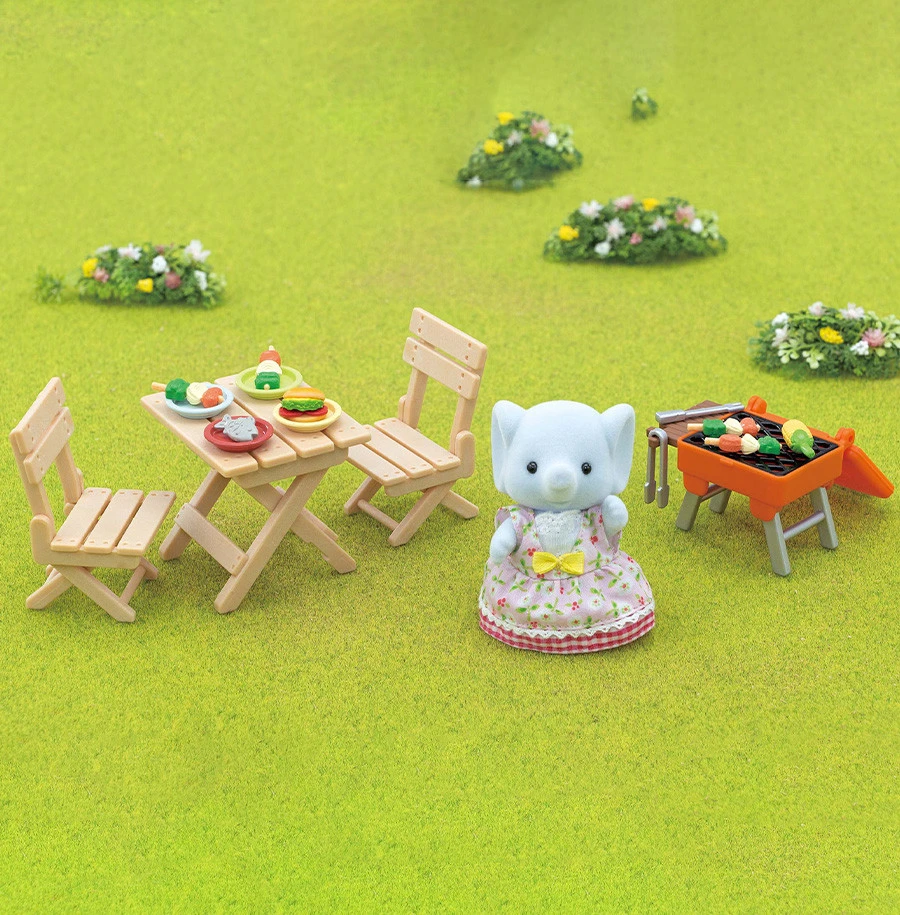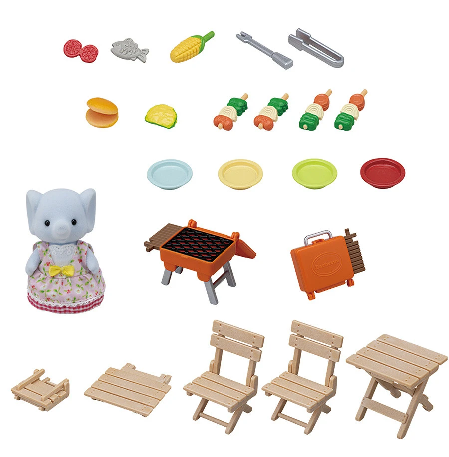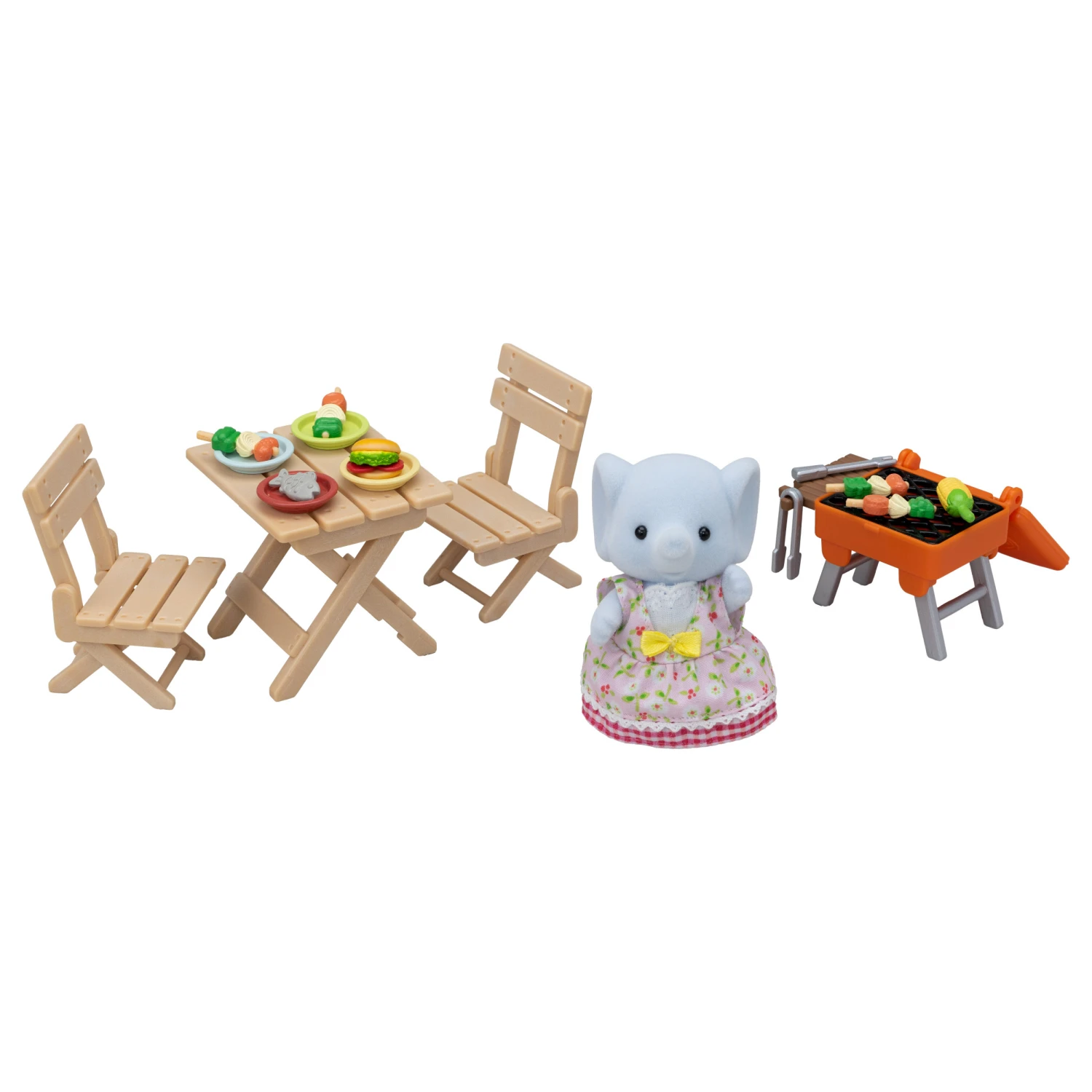 Ce set est composé de tout le nécessaire pour organiser un barbecue : 1 barbecue, 1 table et 2 chaises, des aliments à griller et la fille éléphant.