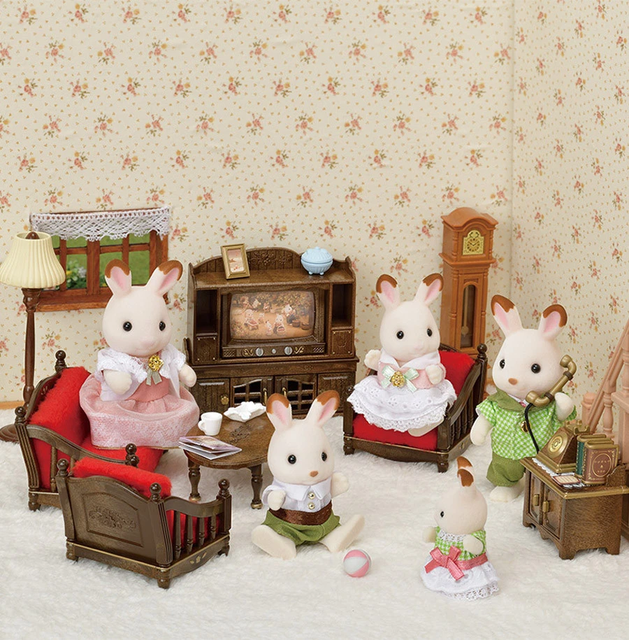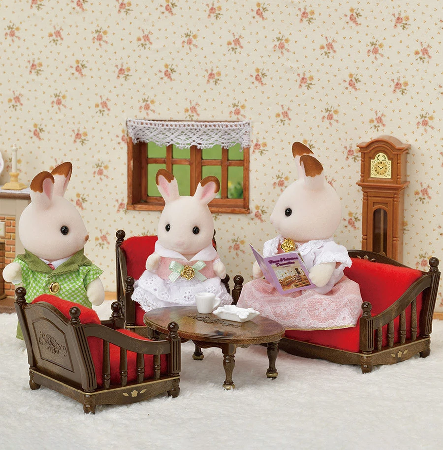 Les jolis détails gravés sur chaque élément et les liserés dorés apportent une touche chic à la salle de séjour des Sylvanian Families.