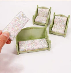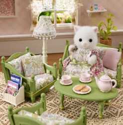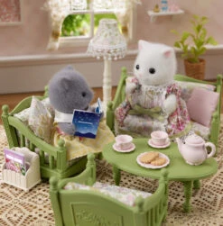 Ce set est idĂ©al pour meubler les maisons des Sylvanian Families avec ses jolies couleurs blanche et verte qui se marient parfaitement avec le motif Liberty.Â