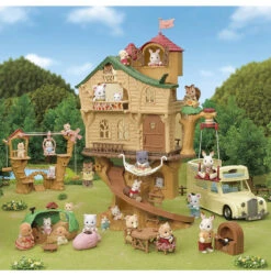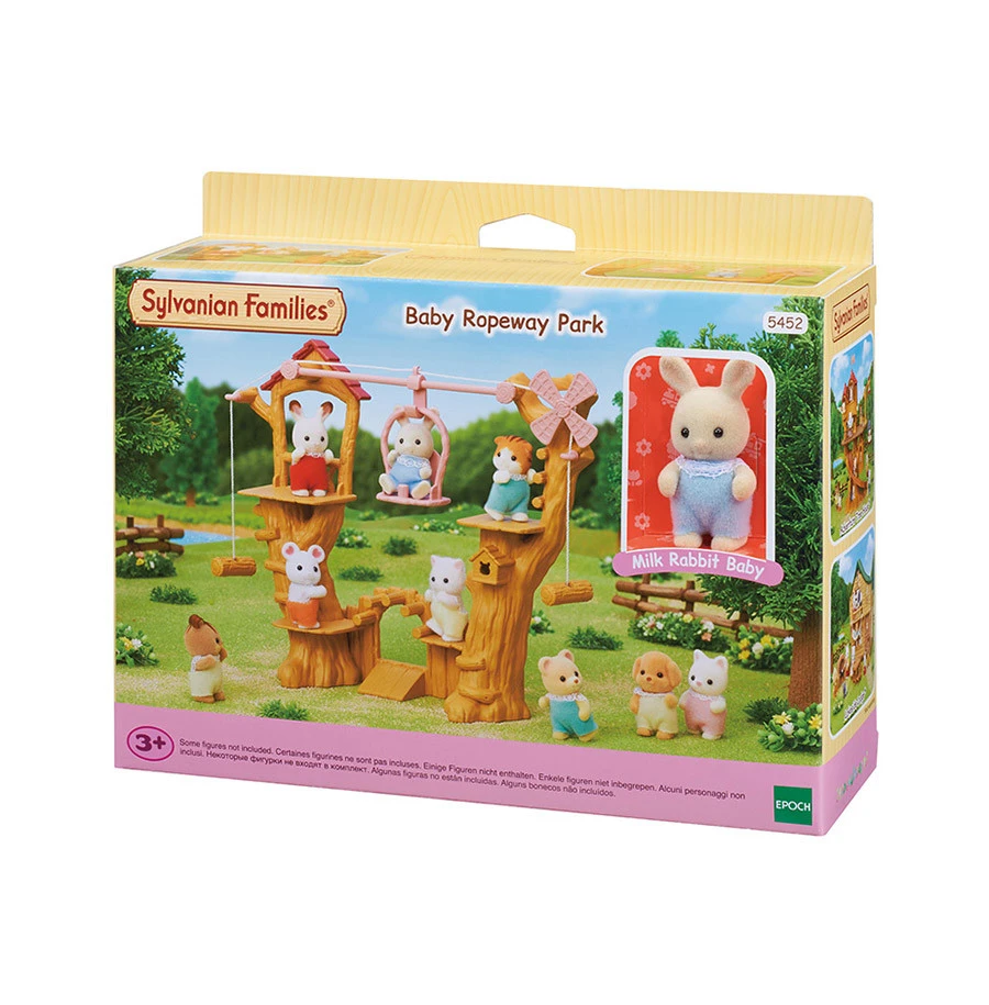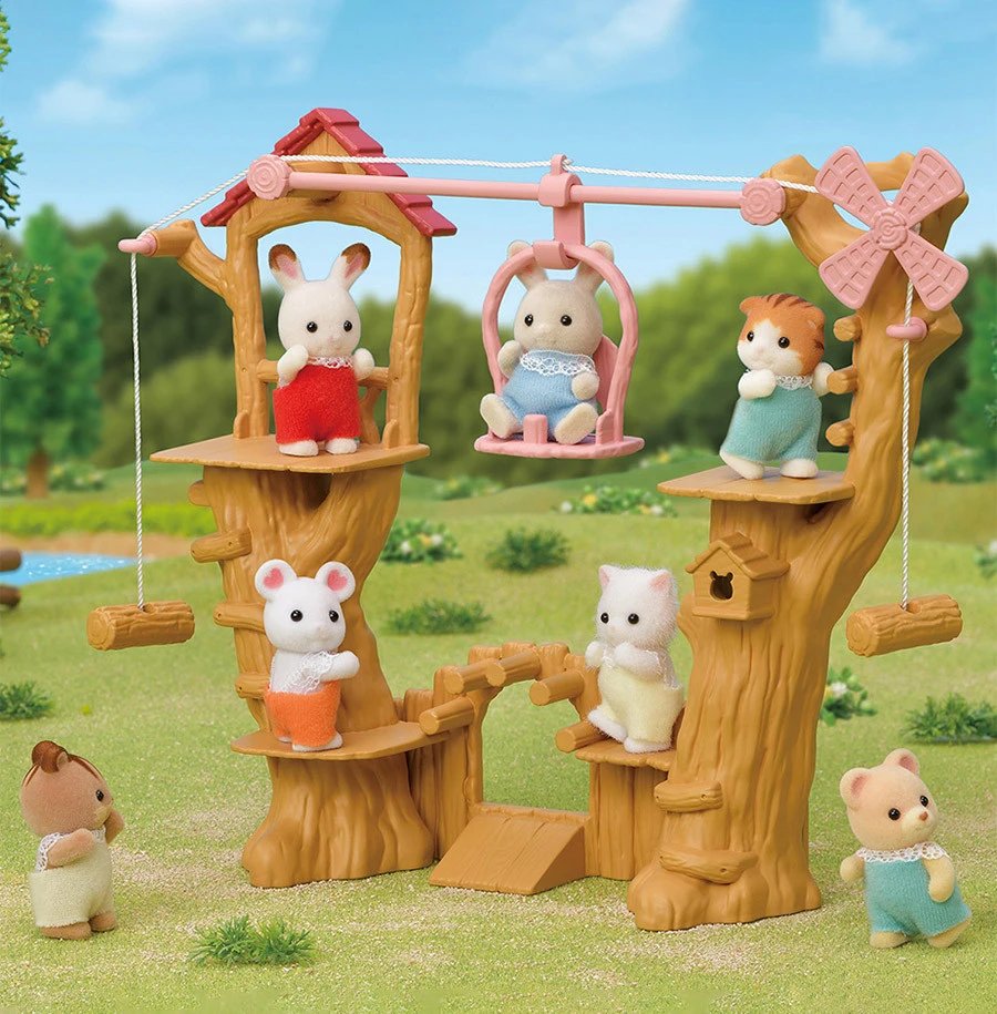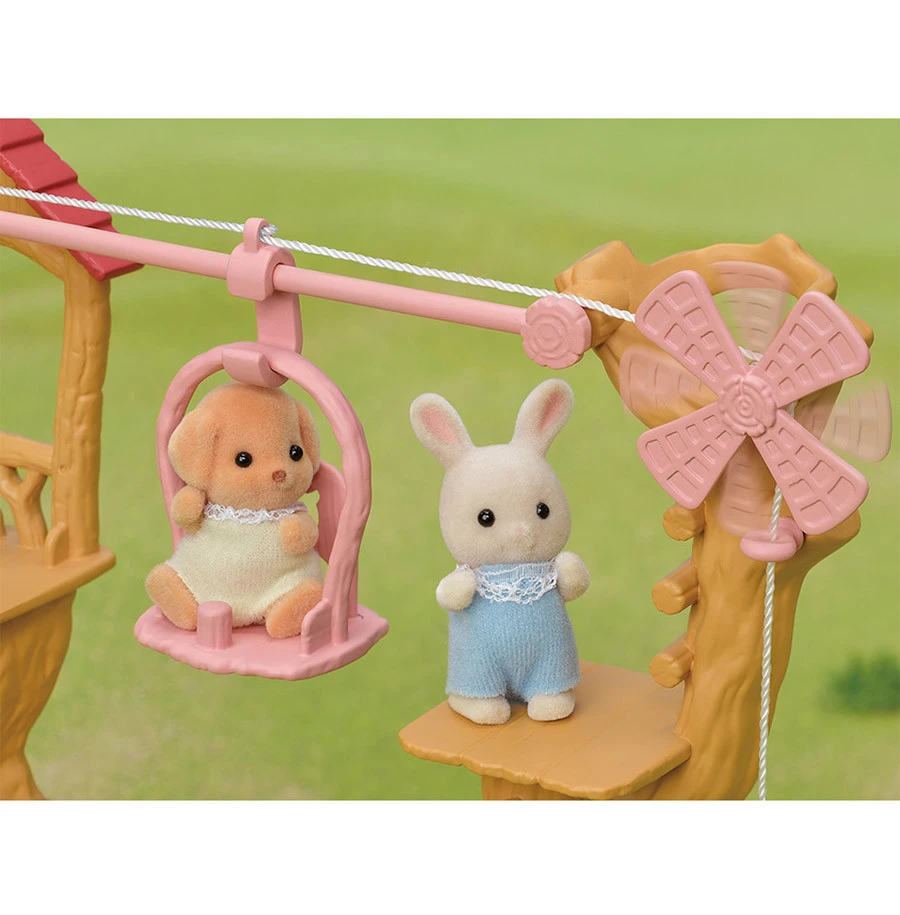 La tyrolienne des bébés permet de déplacer une figurine (bébé uniquement), d’un bout à l’autre de la structure à l’aide des rondins de bois. Elle comprend une structure en forme d’arbre avec deux plateformes, un moulin à vent, une nacelle et deux rondins de bois reliés par une ficelle. Elle est livrée avec Henry, le bébé lapin crème. La tyrolienne des bébés peut être connectée à la cabane dans les arbres pour créer un véritable par d’aventure en pleine nature !