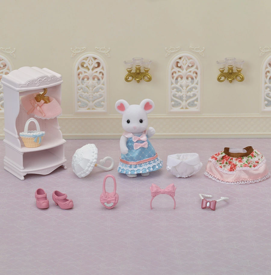 Ce set comprend une figurine grande sĆur souris marshmallow, une penderie pour ranger tous ses vĂȘtements, une robe, une jupe, un chemisier, un chĂąle, une paire de chaussures et des accessoires de mode comme un serre-tĂȘte, un sac Ă main ou une ombrelle.Â