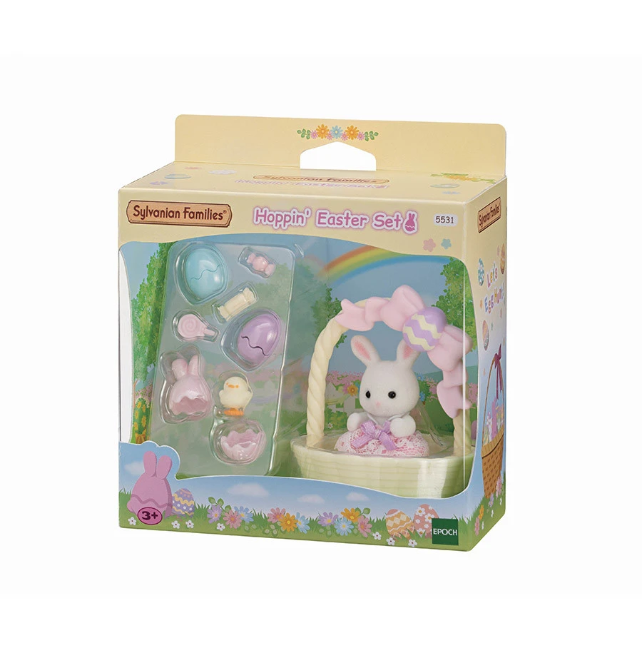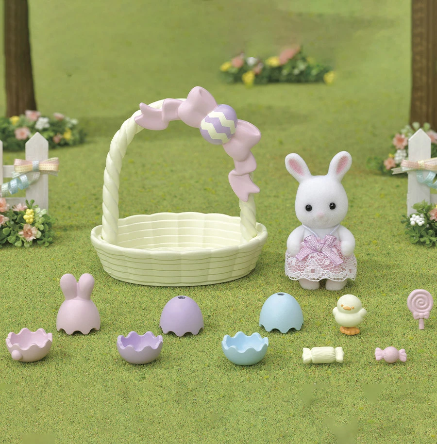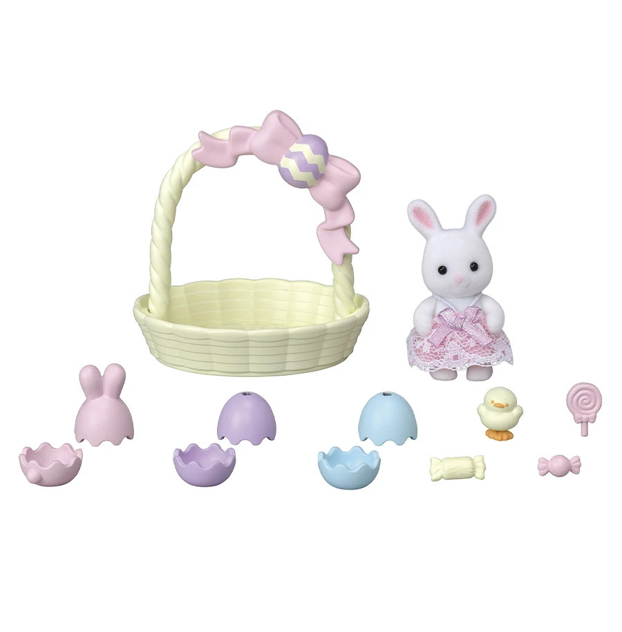 Ce coffret comprend une figurine bébé lapin blanc articulée et vêtue d’une robe à mettre et enlever à loisir ainsi qu’un panier et des œufs à remplir avec les jouets et bonbons fournis.
