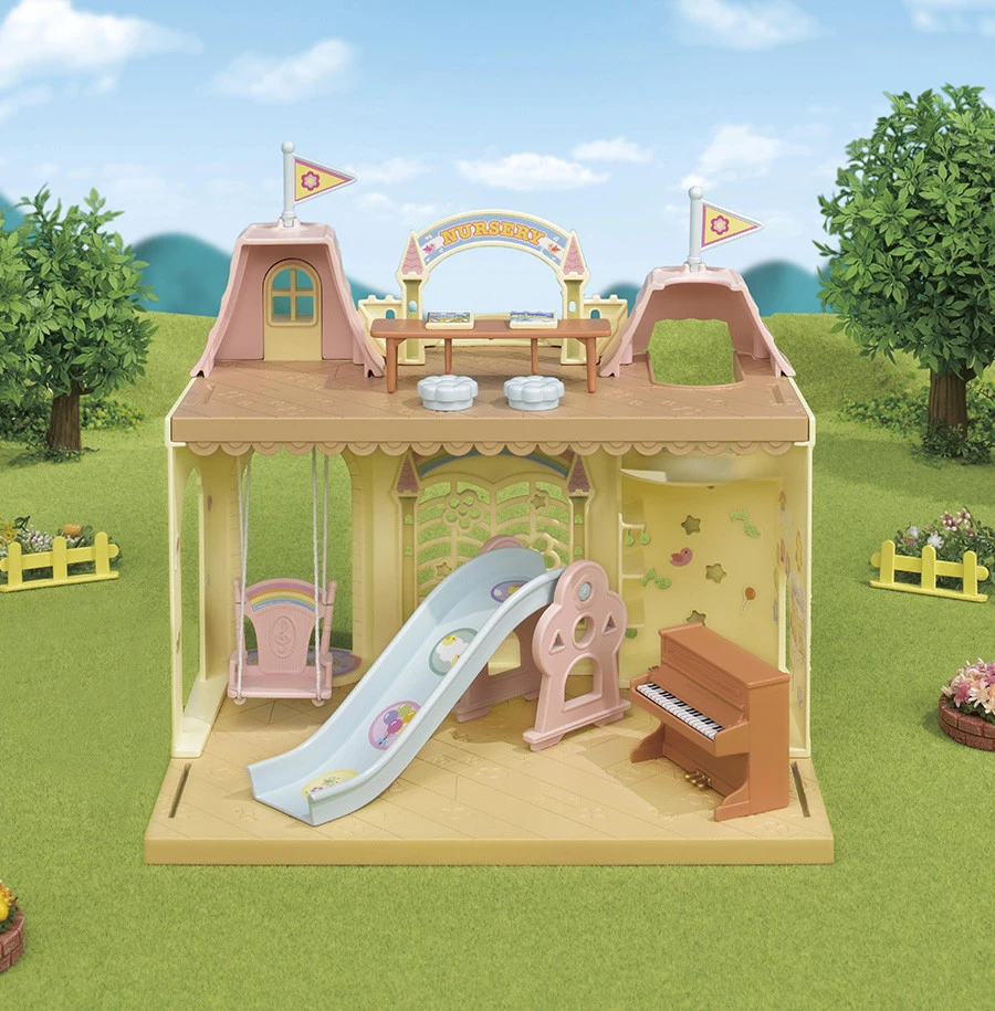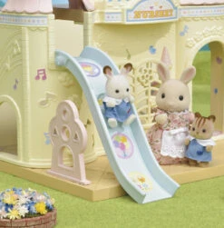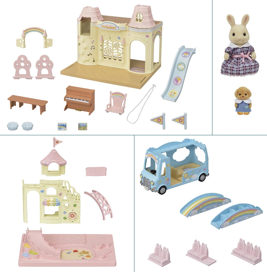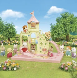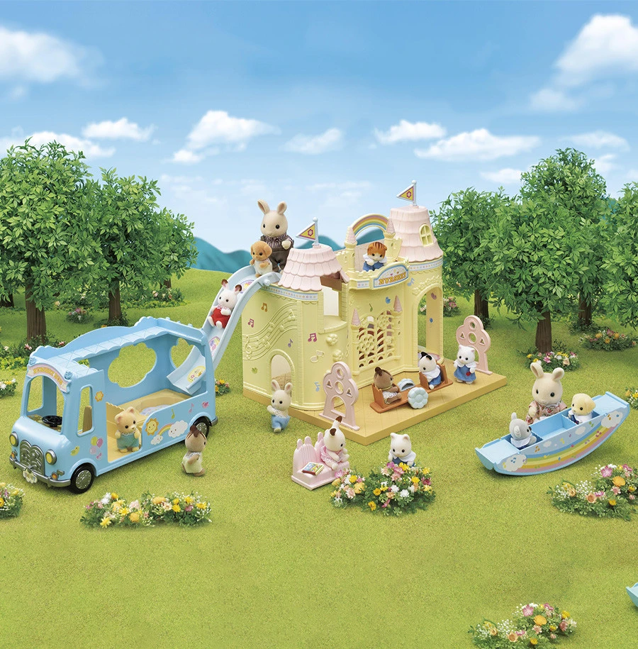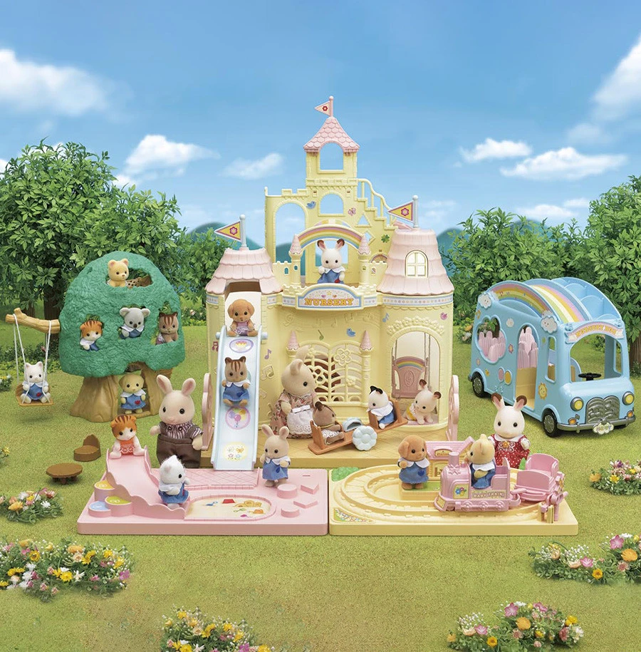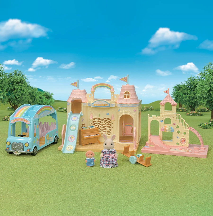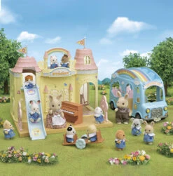 Offrez ce coffret à votre enfant, comprenant plus de 25 pièces et 1 figurine maman lapin crème, 1 figurine bébé caniche, 1 crèche des bébés, 1 toboggan, 1 balançoire, 1 piano, 1 table, 2 tabourets, des décorations, 1 bus arc-en-ciel, des sièges amovibles, 1 château des bébés