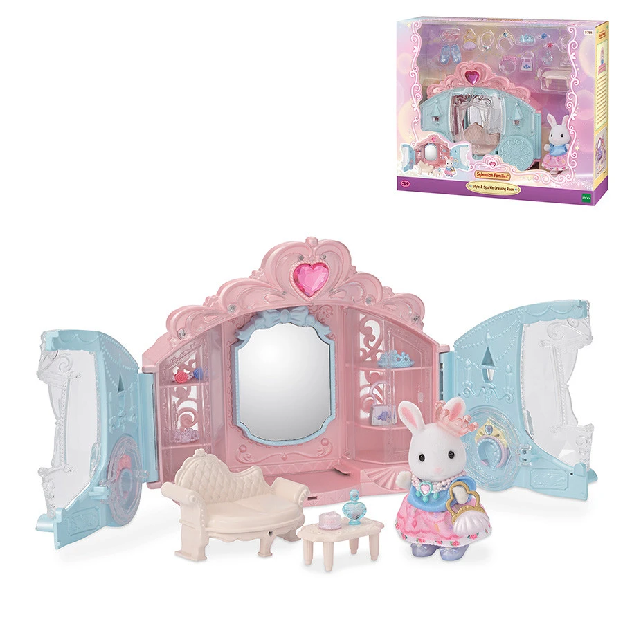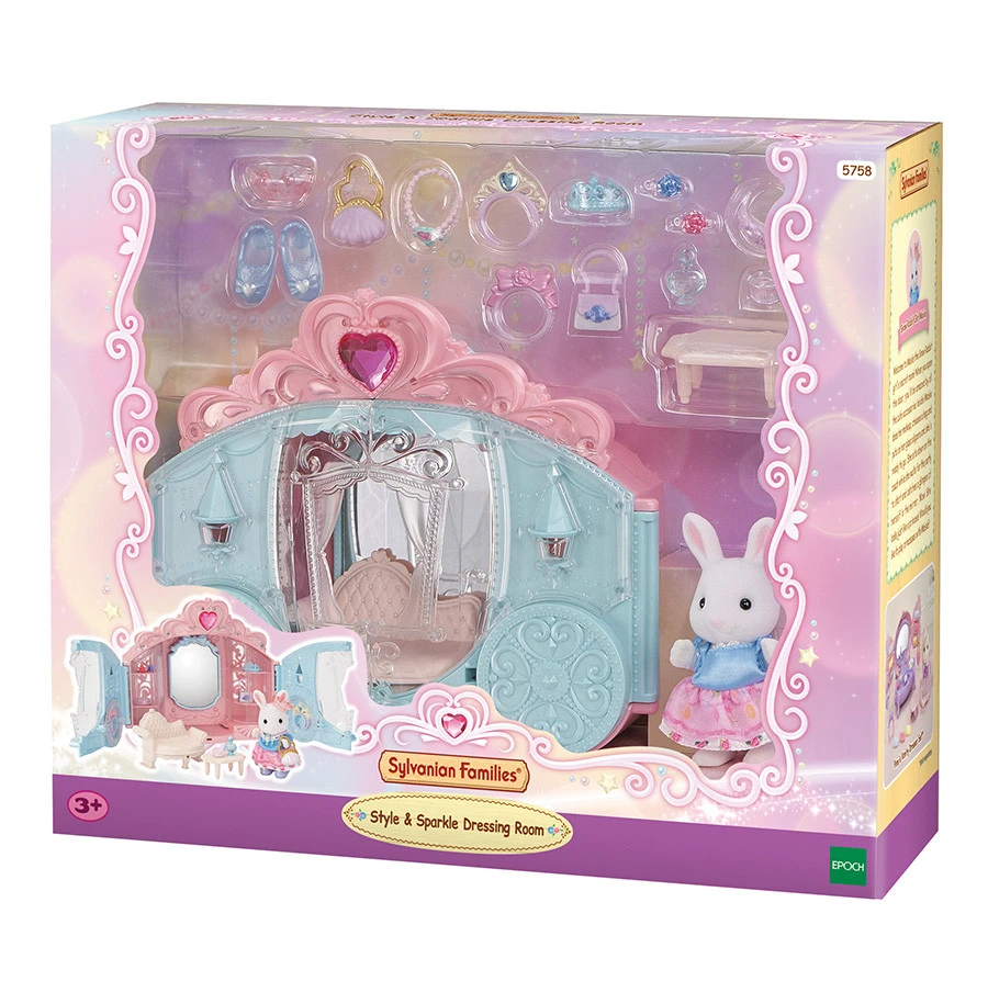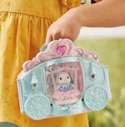 Le coffret le dressing de princesse est un merveilleux Ă©crin en forme de carrosse dans les tons bleu et rose qui s’ouvre et se ferme pour emporter partout avec toi la fille Lapin Neige et ses accessoires de mode.Â