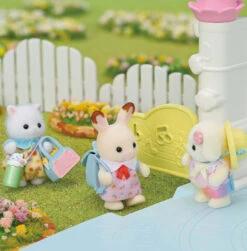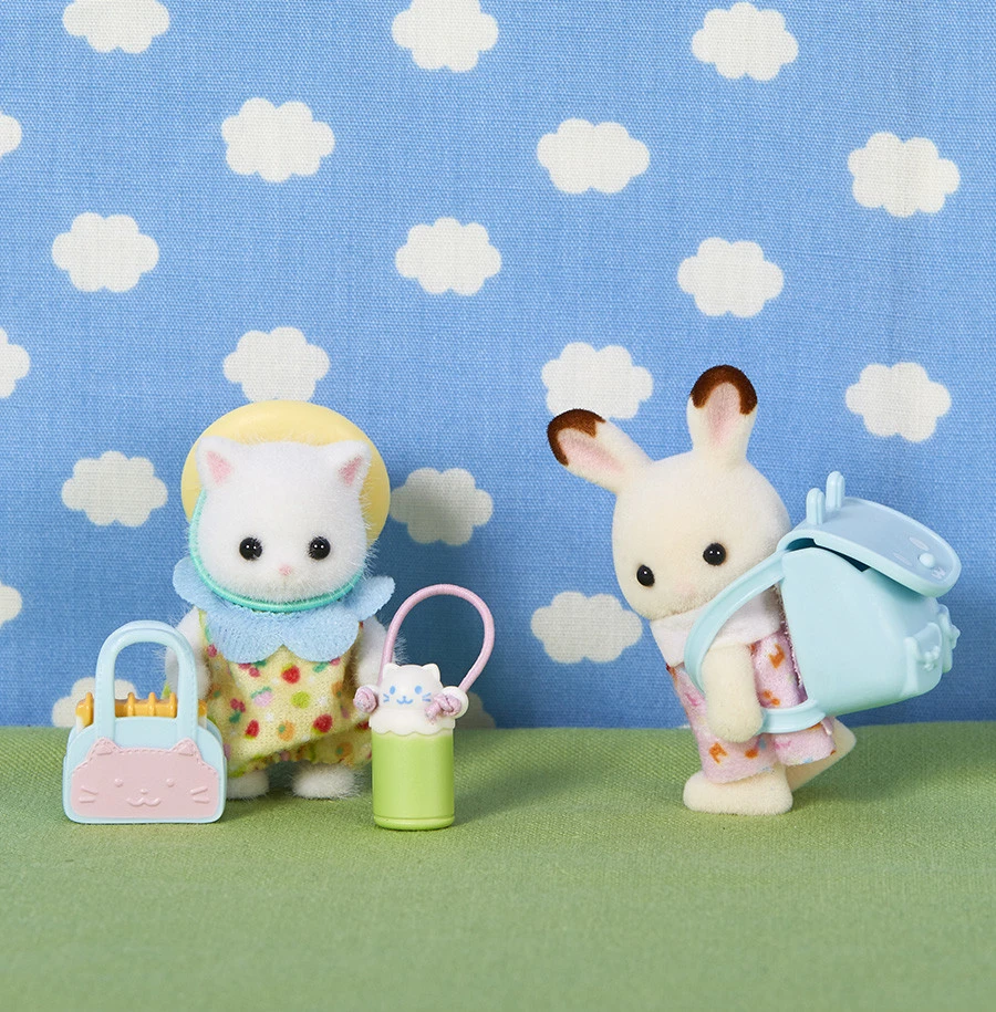 Le bébé Lapin Chocolat et le bébé Chat Persan sont bien équipés pour partir en balade.
