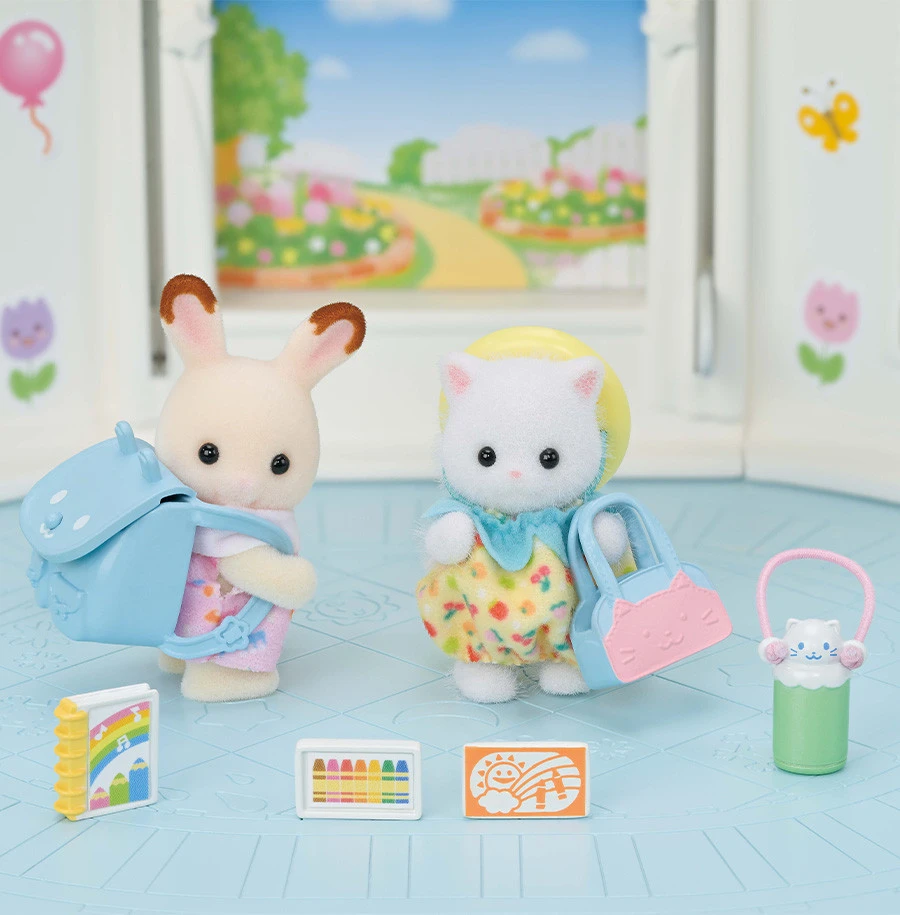Crème le bébé Lapin Chocolat a rangé son livre de coloriage dans son sac à dos lapin et Bonnie le bébé Chat Persan emmène ses pastels et son plus joli dessin dans son sac chat. Elle a même pris son chapeau et une gourde pour ne manquer de rien.