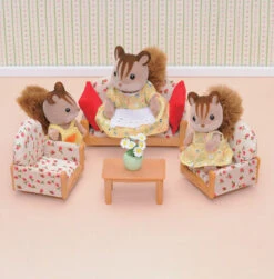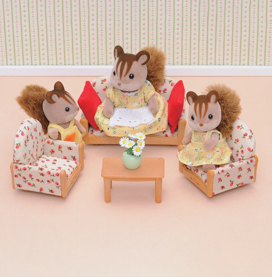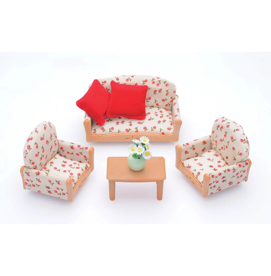 Ce set d’ameublement pour le salon comprend 1 canapĂ©, 2 fauteuils, 1 table basse, 1 pot de fleurs, 2 coussins.