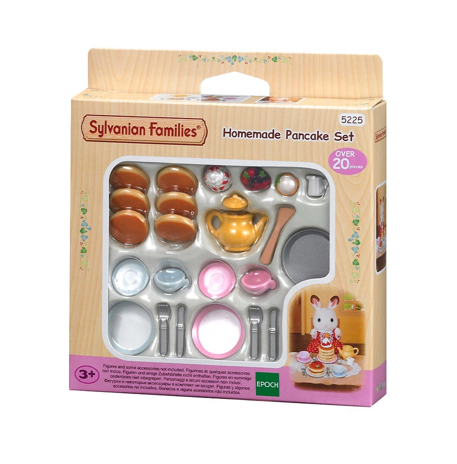 Ce set contient : 6 pancakes, 1 poĂȘle, une thĂ©iĂšre, 2 tasses et leurs soucoupes, 2 assiettes, 2 fourchettes, 2 couteaux, 1 spatule, 1 pot Ă lait et 3 friandises.