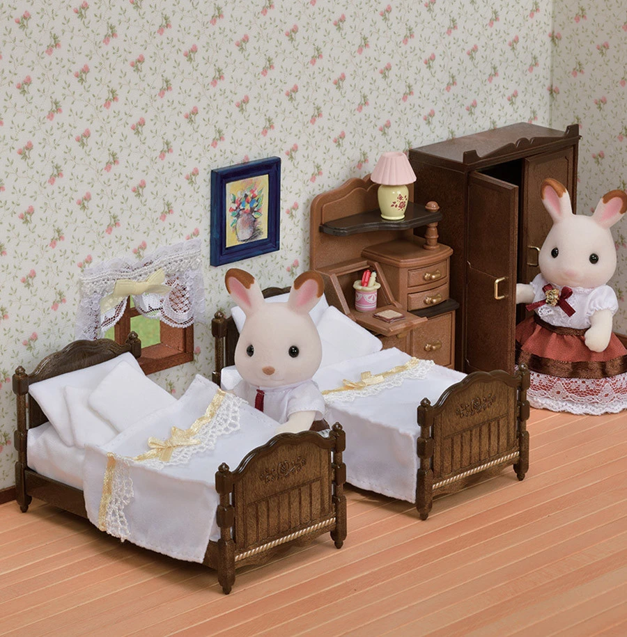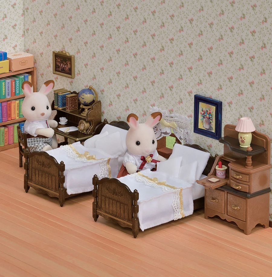Ce set alliant un lit trĂšs confortable avec sa jolie parure de draps ainsi qu’une commode est idĂ©al pour meubler la chambre des Sylvanian. Plus de problĂšme de rangement dans la chambre, ils peuvent maintenant dormir sur leurs deux oreilles !