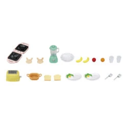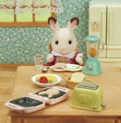 Il est composĂ© d’un appareil Ă pancakes et ses deux pancakes en forme de tĂȘte de lapin, d’un blender pour prĂ©parer des smoothies et autres dĂ©licieuses boissons mixĂ©es, un grille-pain et ses deux toasts ainsi que des fruits et de la vaisselle pour deux personnes.