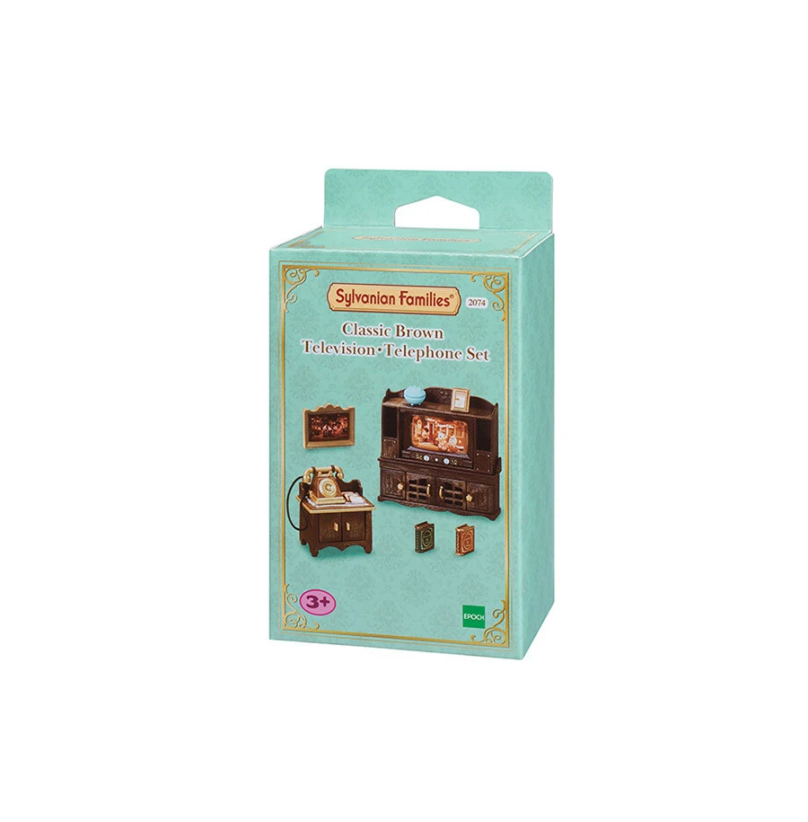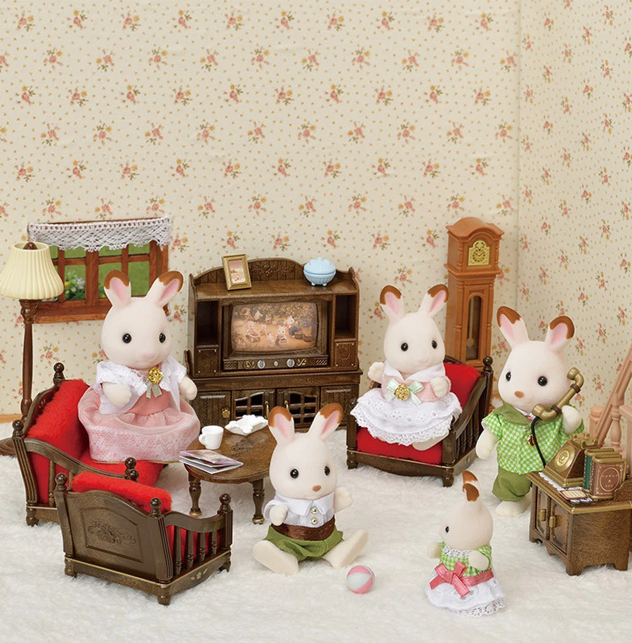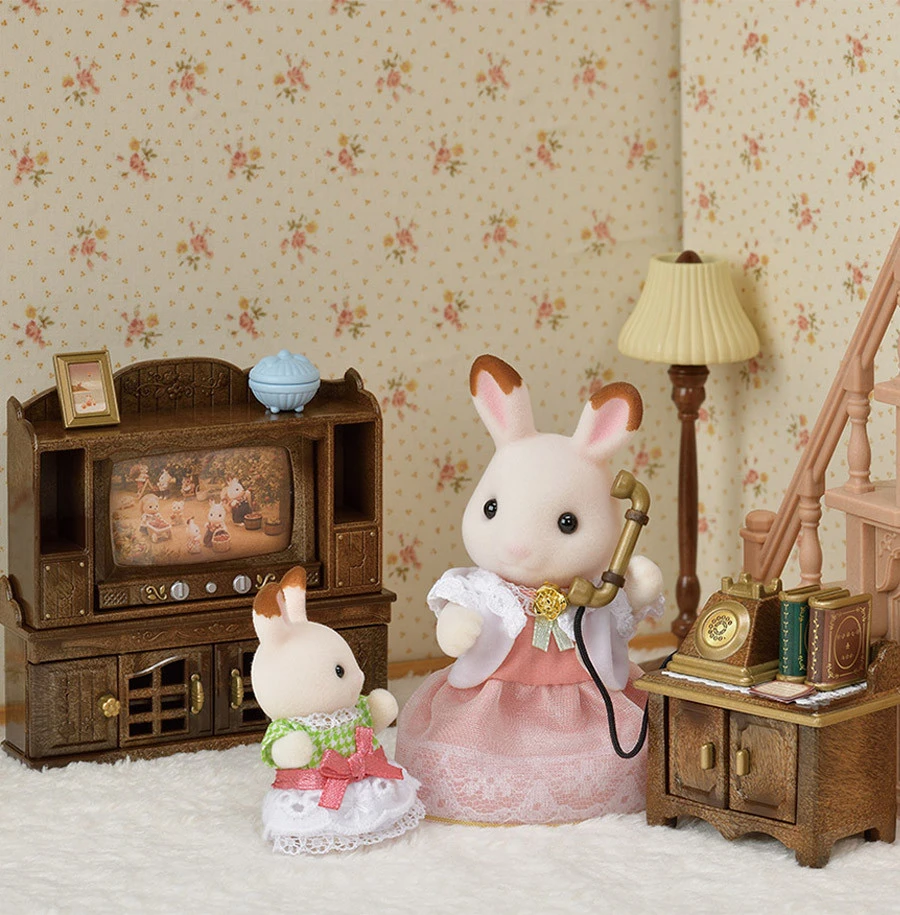 Le meuble TV et le meuble téléphone ont un revêtement imitant le bois pour donner un côté chaleureux au salon des Sylvanian Families.