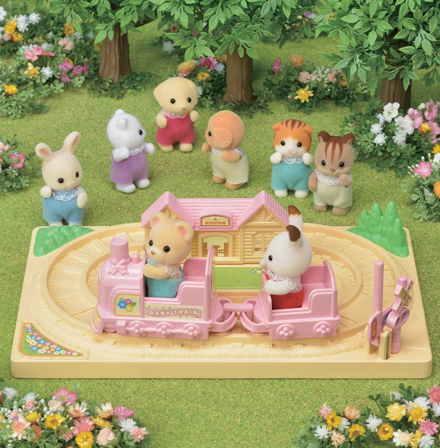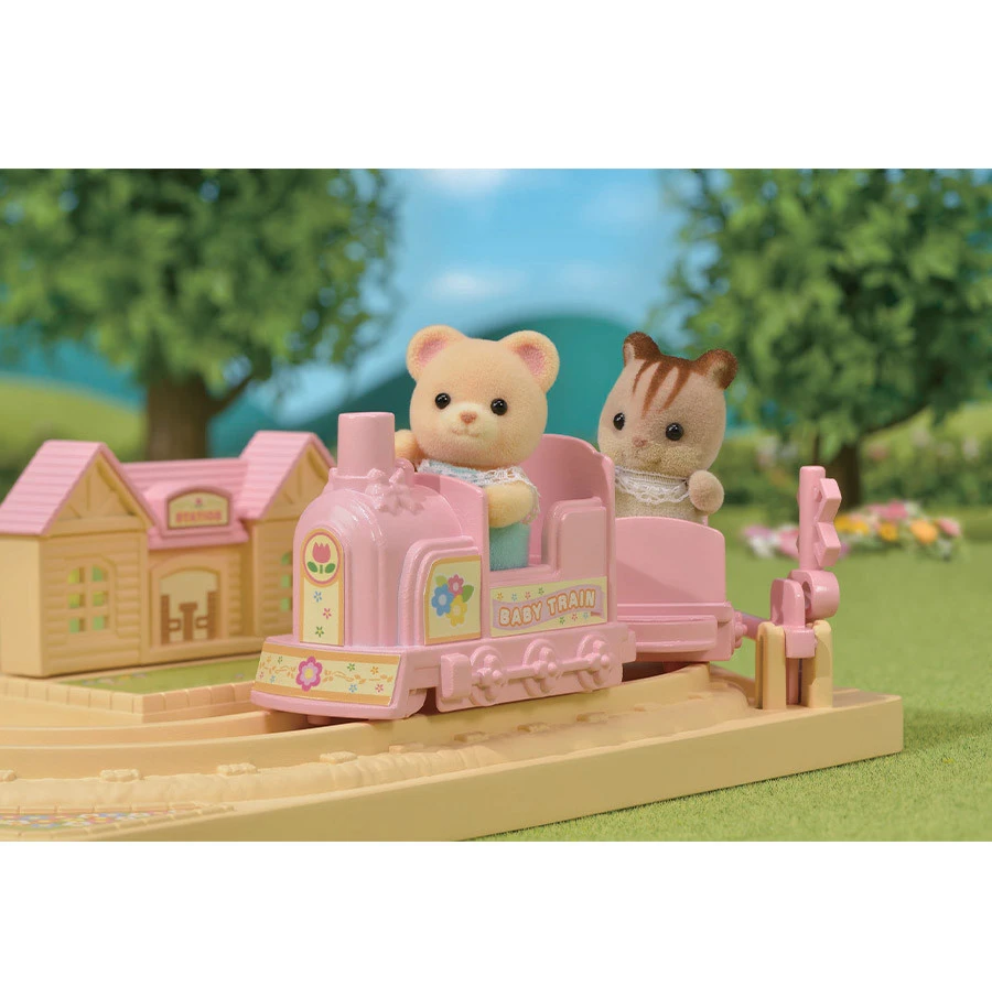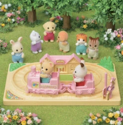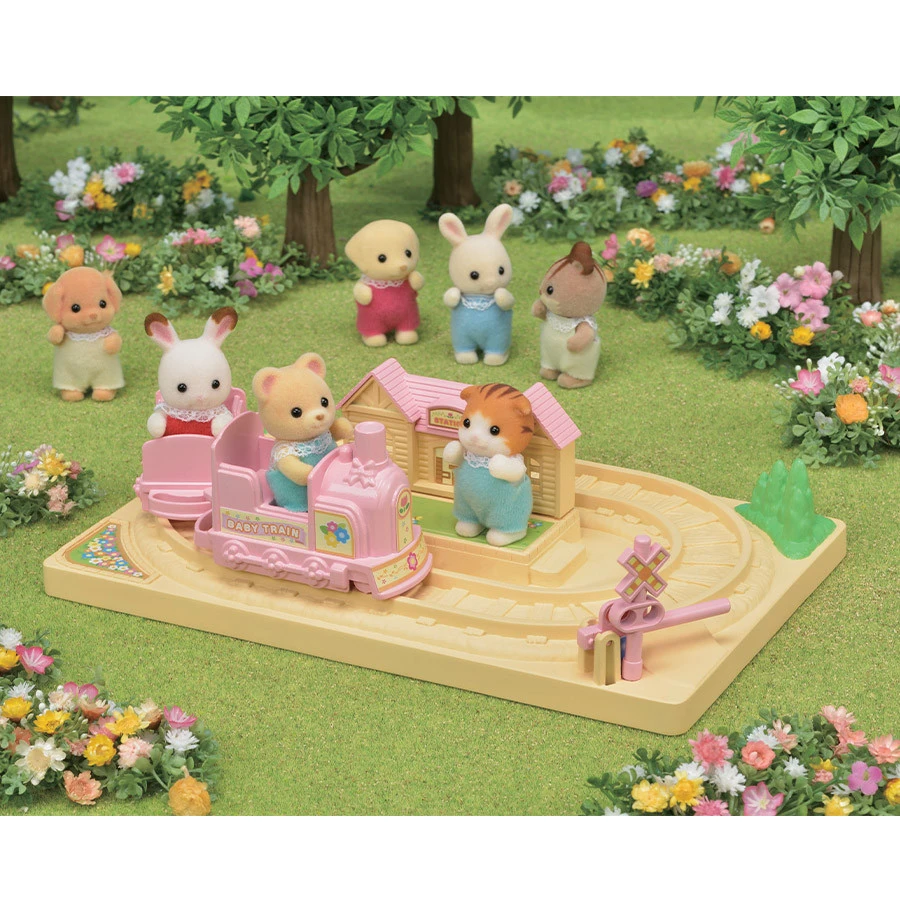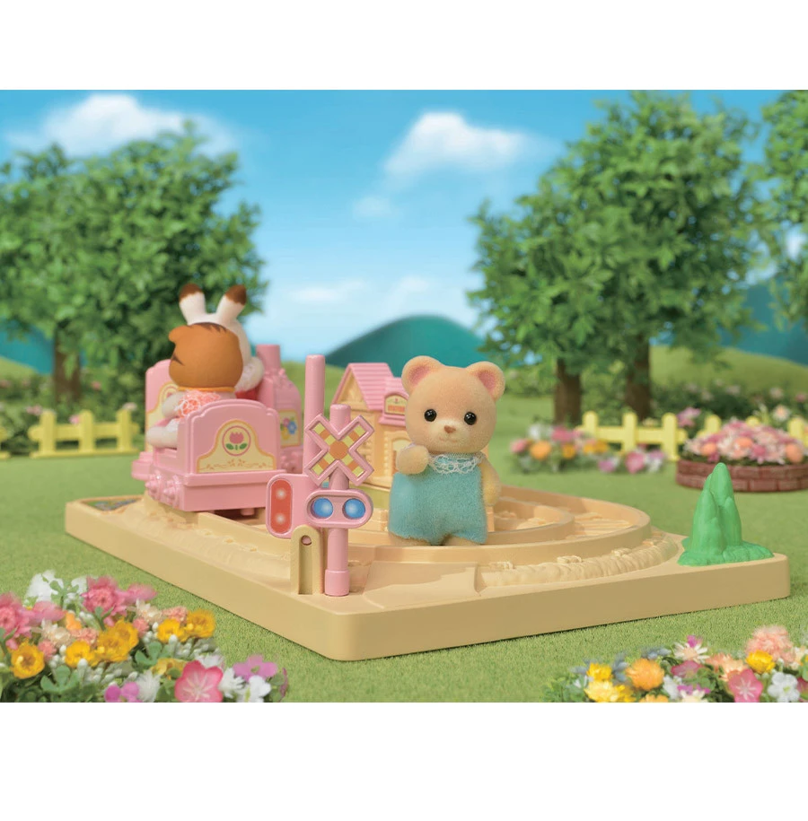 Le train tchou-tchou contient le bébé ours. Ce coffret complet fait partie de la cour de récréation de la crèche des bébés. La locomotive et le wagon peuvent être poussés à la main le long des rails. Une figurine peut prendre place dans le train et/ou dans le wagon. Le passage à niveau est mobile.