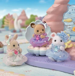 Ce coffret de 3 figurines miniatures comprend : 1 bébé Lapin Crème, 1 bébé Souris Marshmallow, 1 bébé Biche, chacun vêtus d’une robe en tulle coloré et agrémenté de perles et d’un bandeau assorti.