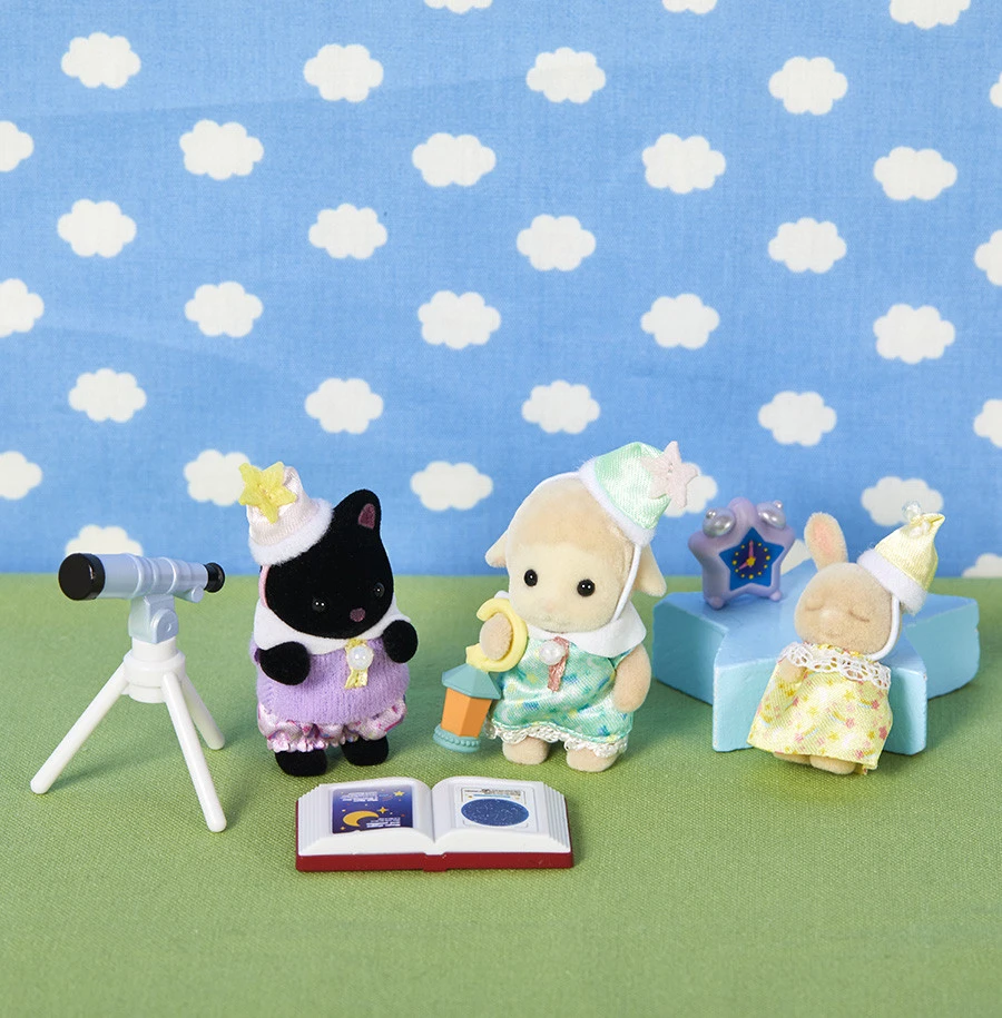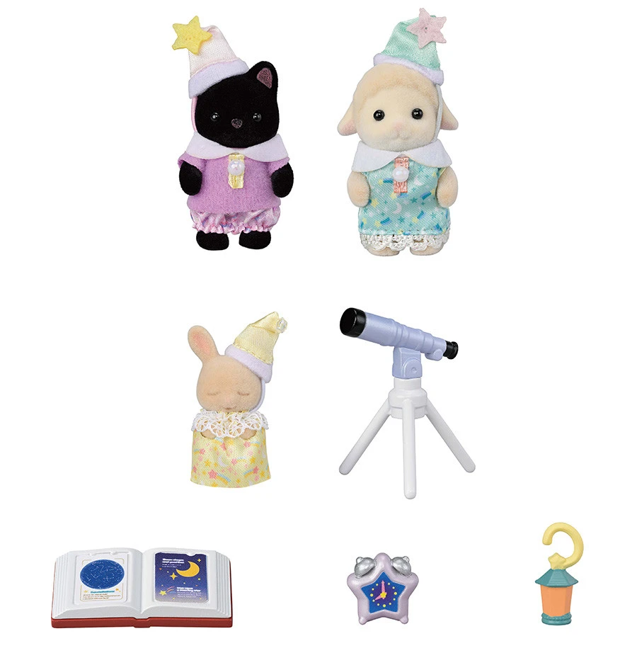 Le trio des bébés pyjama party est composé de 3 figurines bébés (le bébé Chat Magicien, le bébé Mouton, le bébé Lapin Crème avec les yeux fermés) et leurs accessoires pour une soirée pyjama réussie : 1 télescope, 1 réveil, 1 lanterne et 1 livre d’astrologie.