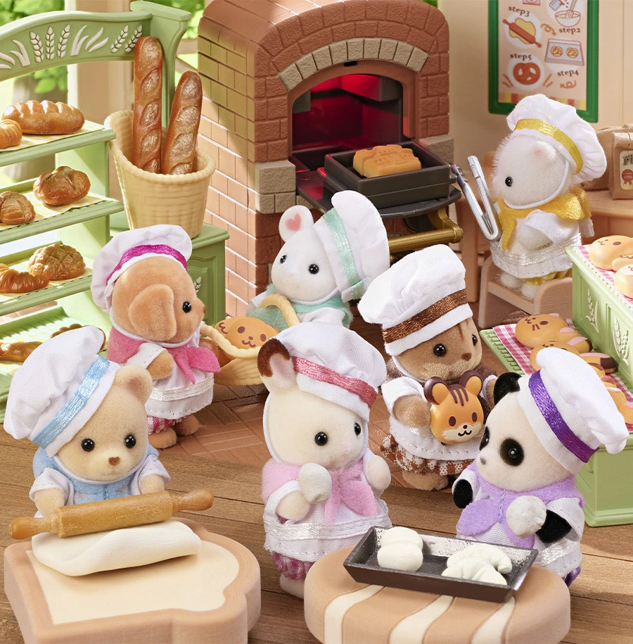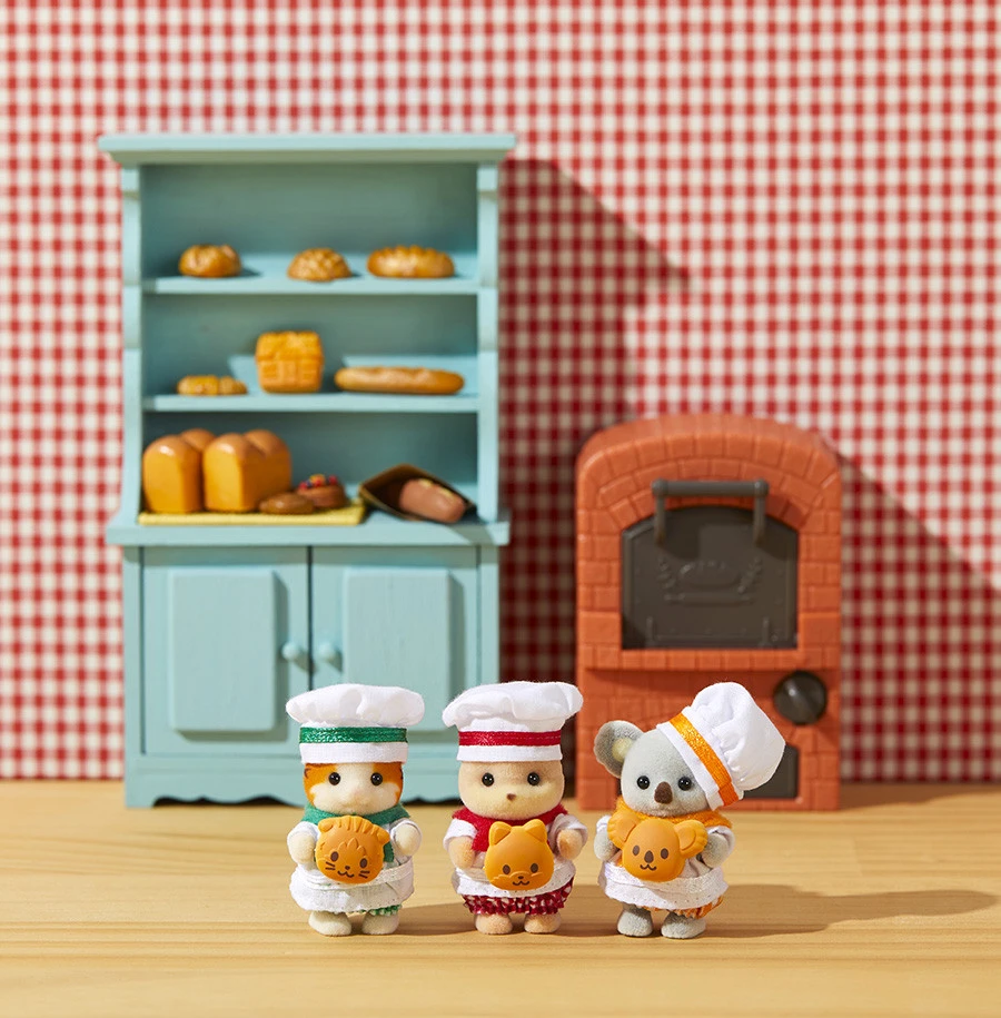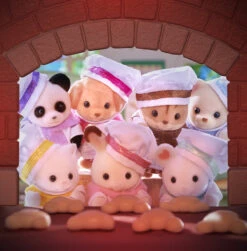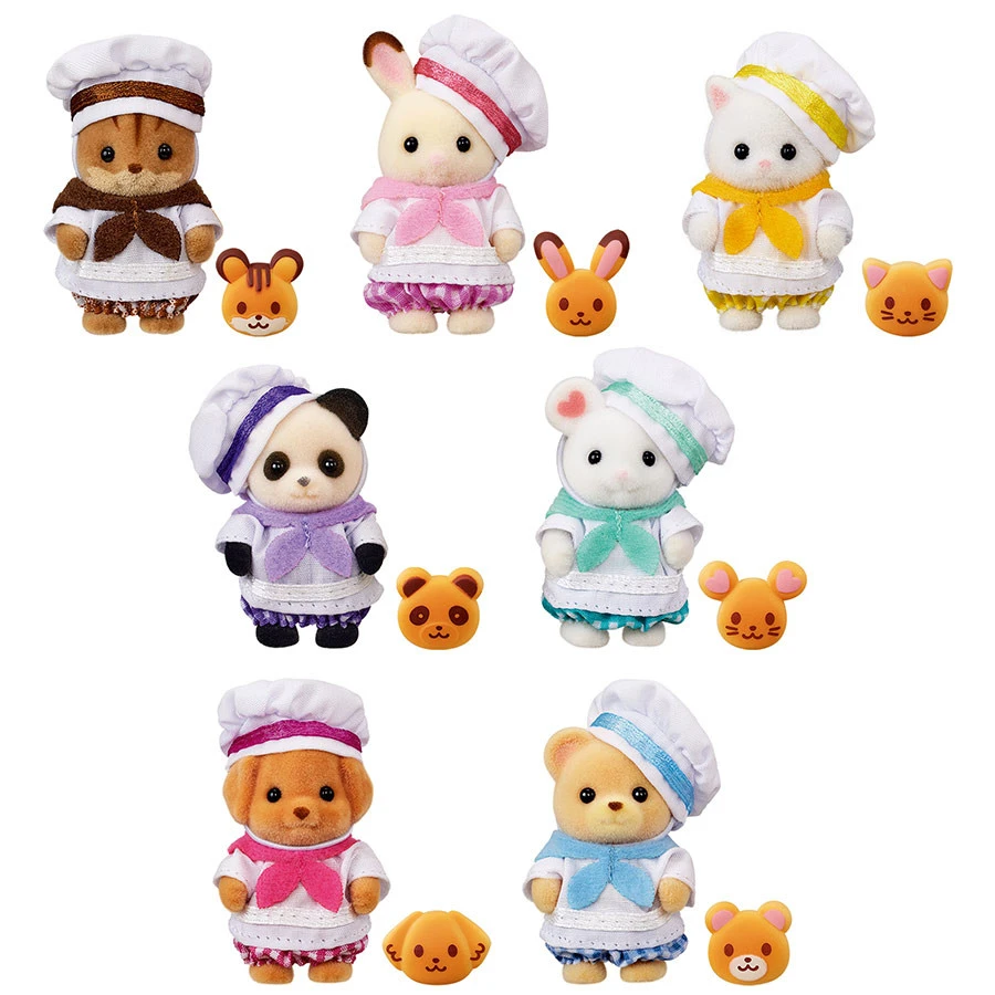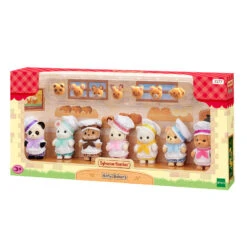 Ce set comprend 7 figurines bébés Sylvanian Families en tenues de boulangers avec leurs petits pains personnalisés : 1 bébé Ecureuil Roux, 1 bébé Lapin Chocolat, 1 bébé Chat Persan, 1 bébé Panda, 1 bébé Souris Marshmallow, 1 bébé Ours, 1 bébé Caniche.