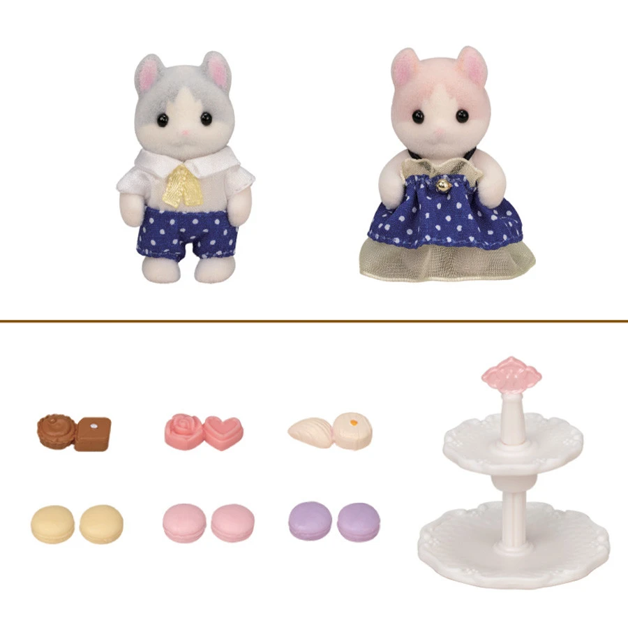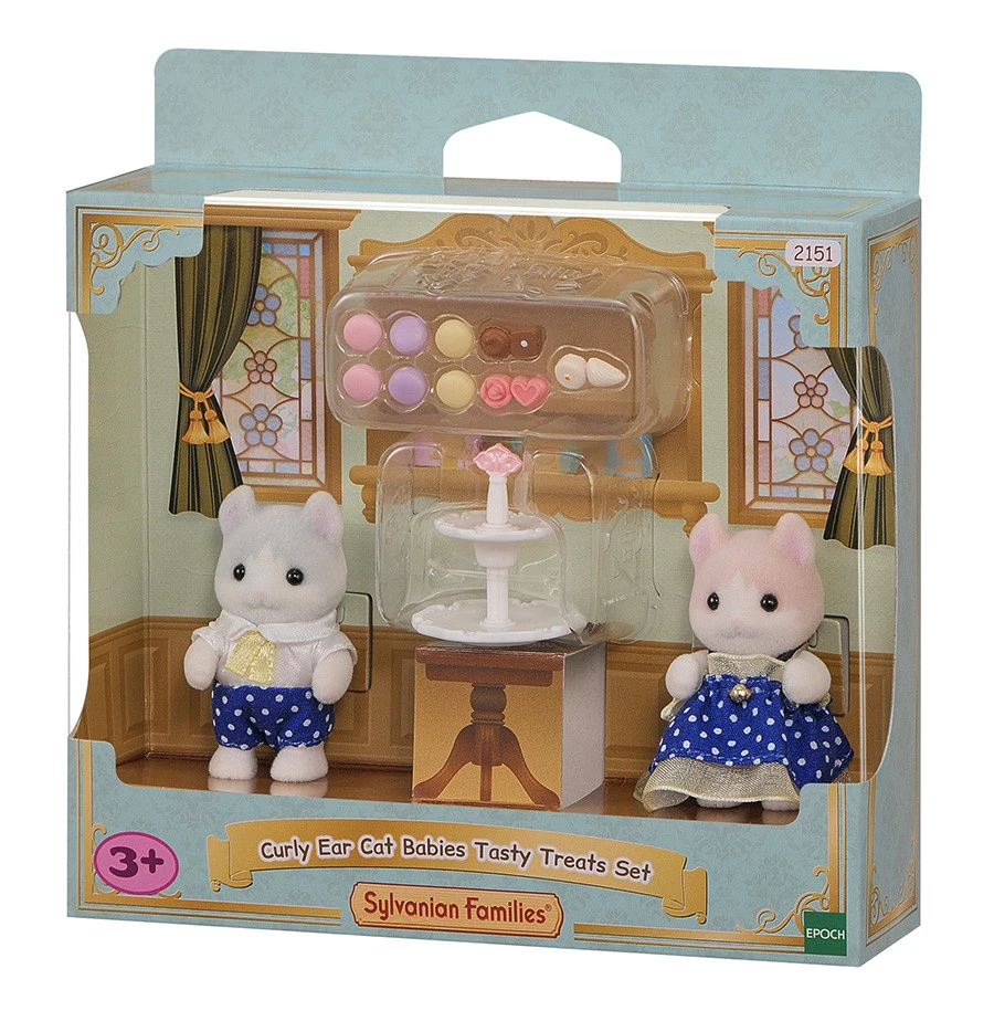 Ce set comprend 2 figurines bébé Chat American Curl ainsi qu’un plateau à pâtisseries, 6 macarons colorés et 6 gâteaux.