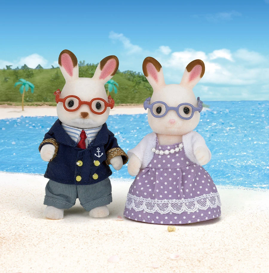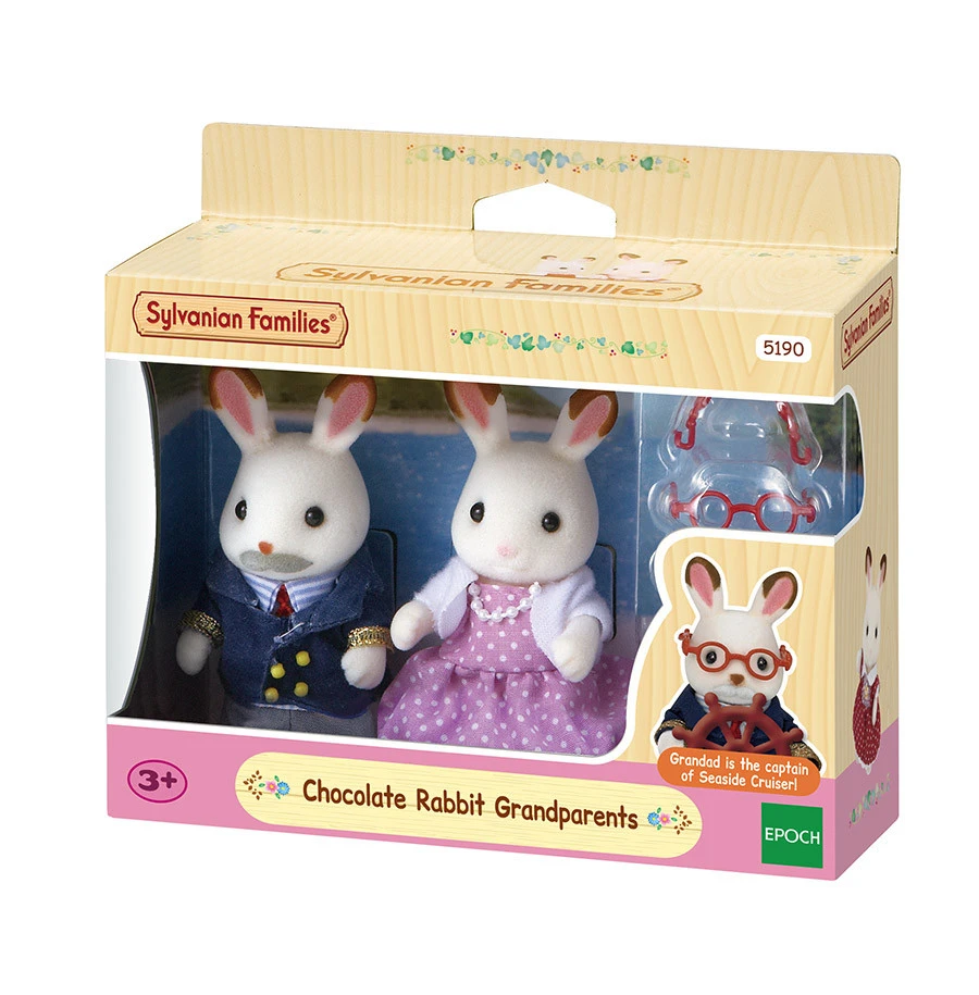 Les grands-parents lapin chocolat portent des lunettes amovibles et sont articulés. Leurs vêtements peuvent être mis et enlevés à loisir. Ils complètent la famille lapin chocolat (vendue séparément).