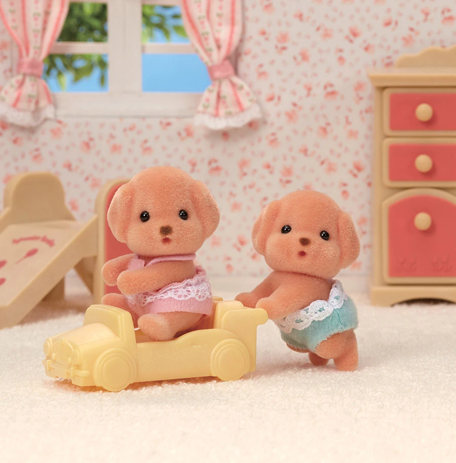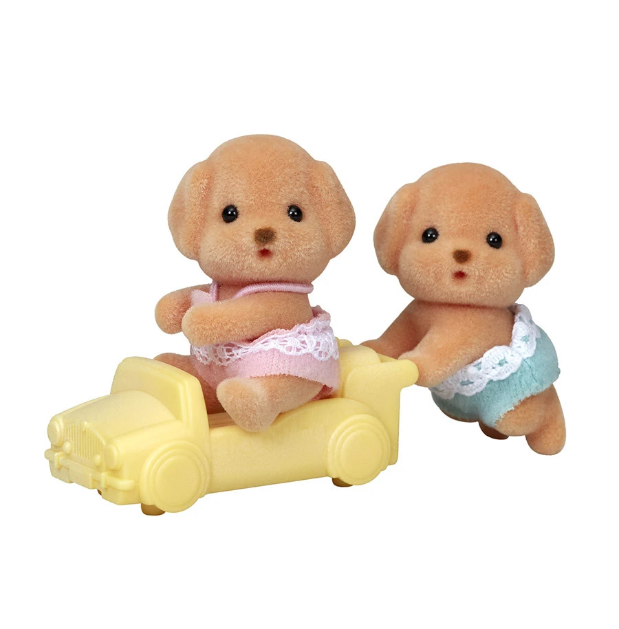 Les jumeaux caniche sont livrĂ©s avec une voiturette et seule leur tĂȘte est mobile.