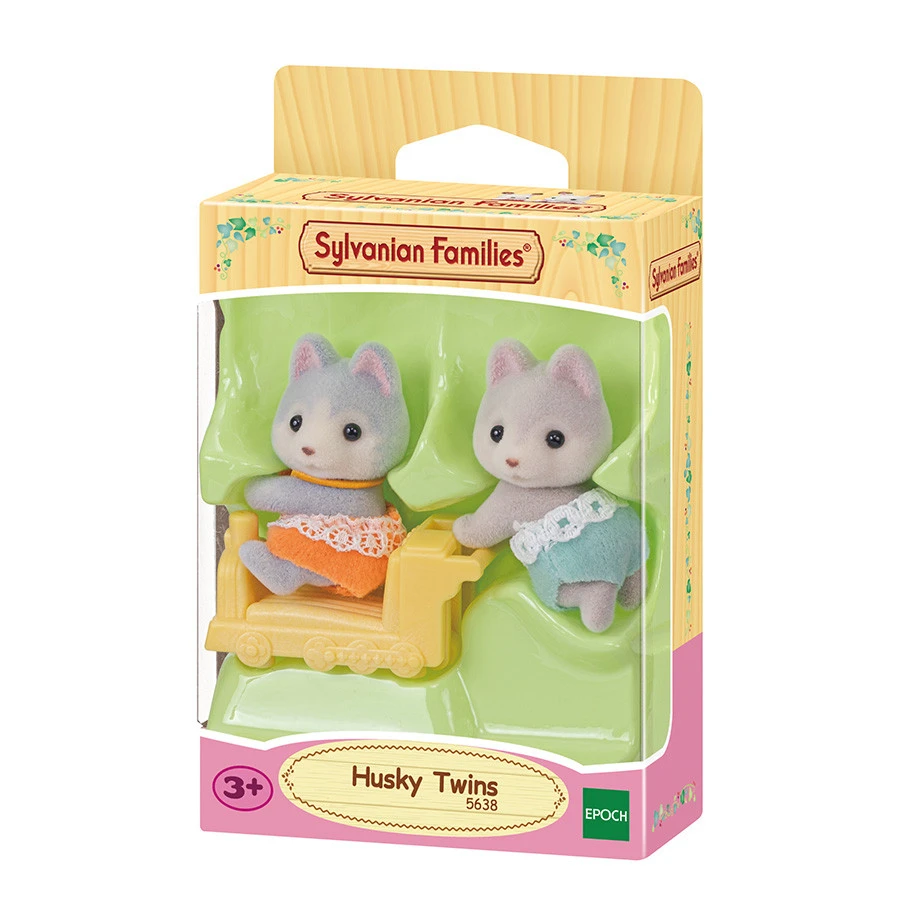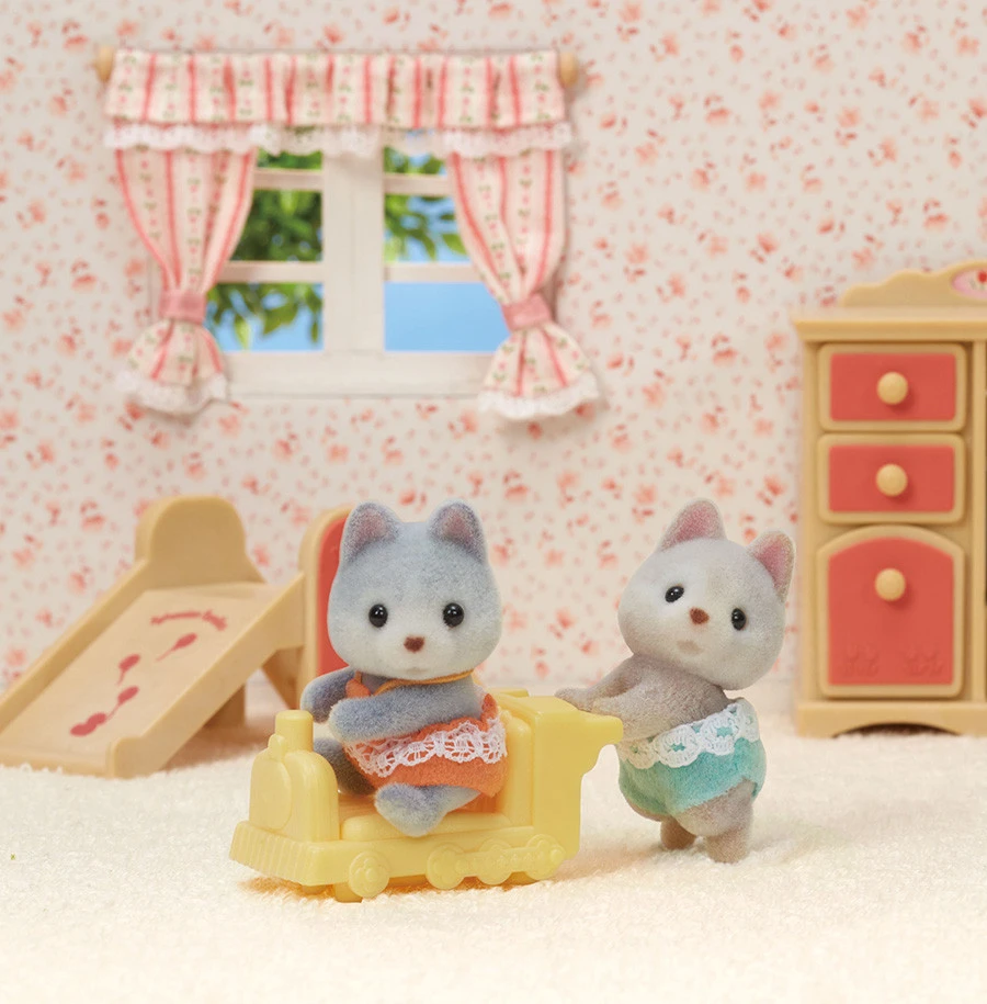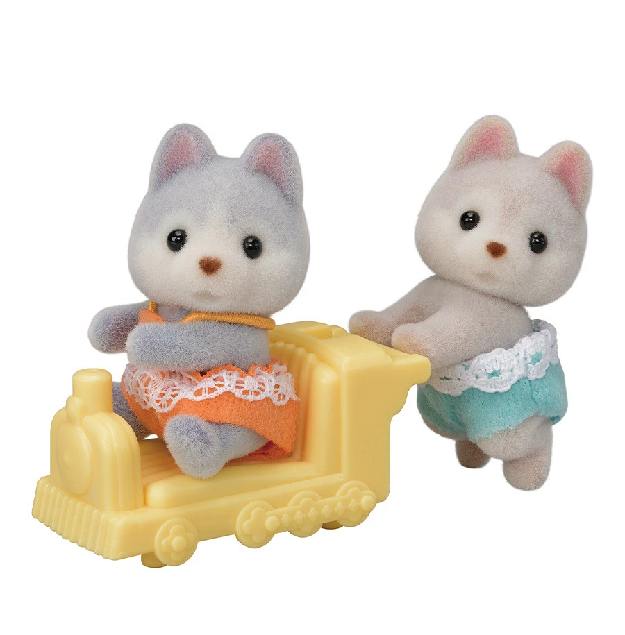 Les jumeaux Husky Sylvanian Families sont composĂ©s de deux bĂ©bĂ©s Husky vĂȘtus d’un pyjama amovible et d’une petite locomotive.Â